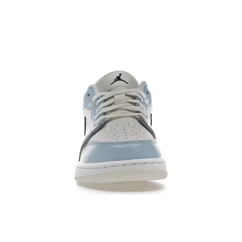 Cholewka butów utrzymana jest głównie w kolorze czarnym, z subtelny akcentem w postaci odcienia Ice Blue na obszarze kołnierza oraz detali. To połączenie kolorów nadaje butom wyjątkowej dynamiki i oryginalności. Charakterystyczne dla modelu Jordan 1 detale, takie jak logo Wings na kostce i logo Swoosh na bokach, dodają butom autentyczności i dziedzictwa marki.