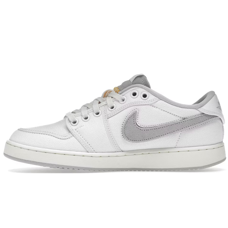 Cholewka butów wykonana jest z białego płótna, nadając im lekkości i świeżości. Charakterystyczne dla modelu AJKO detale, takie jak logo Wings na kostce i logo Swoosh na bokach, podkreślają autentyczność i dziedzictwo marki Air Jordan. Dodatkowo, unikalne detale wzorowane na stylu Union, jak na przykład subtelne odcienie szarości na kołnierzu i charakterystyczna składana etykieta języka, dodają butom niepowtarzalnego charakteru.