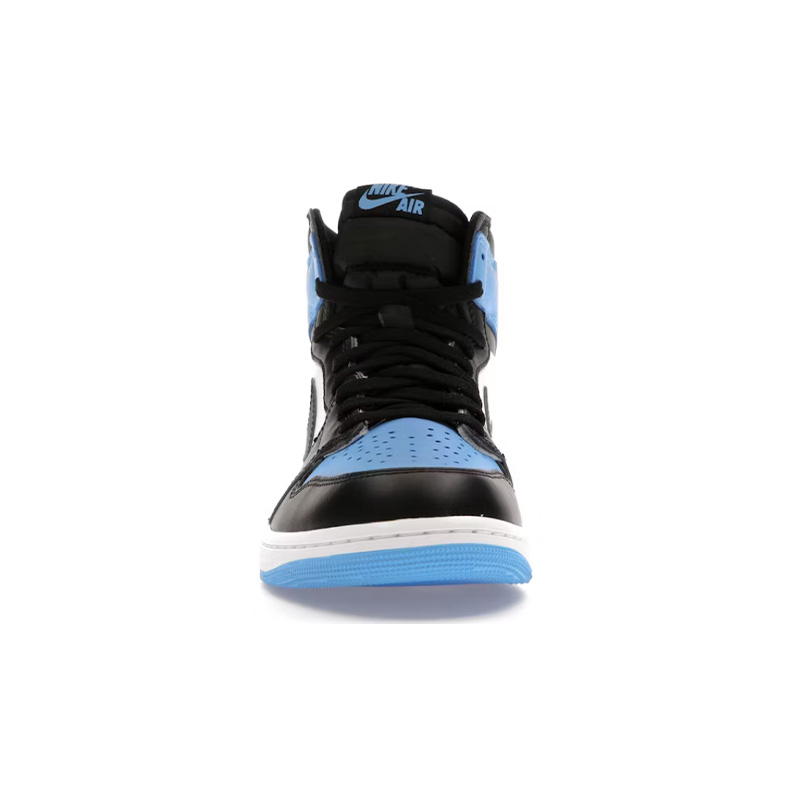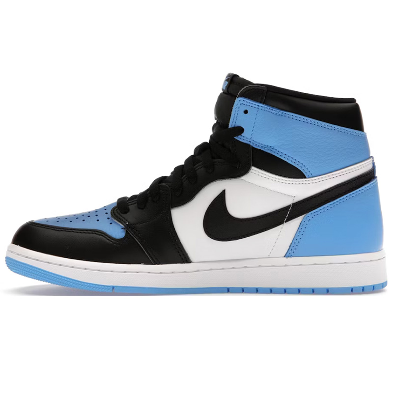 Cholewka butów utrzymana jest w połączeniu białego, niebieskiego i czarnego, co nadaje im charakterystyczny wygląd nawiązujący do barw zespołu koszykarskiego UNC. Charakterystyczne dla modelu Jordan 1 detale, takie jak logo Wings na kostce oraz logo Swoosh na bokach, podkreślają autentyczność i dziedzictwo marki.