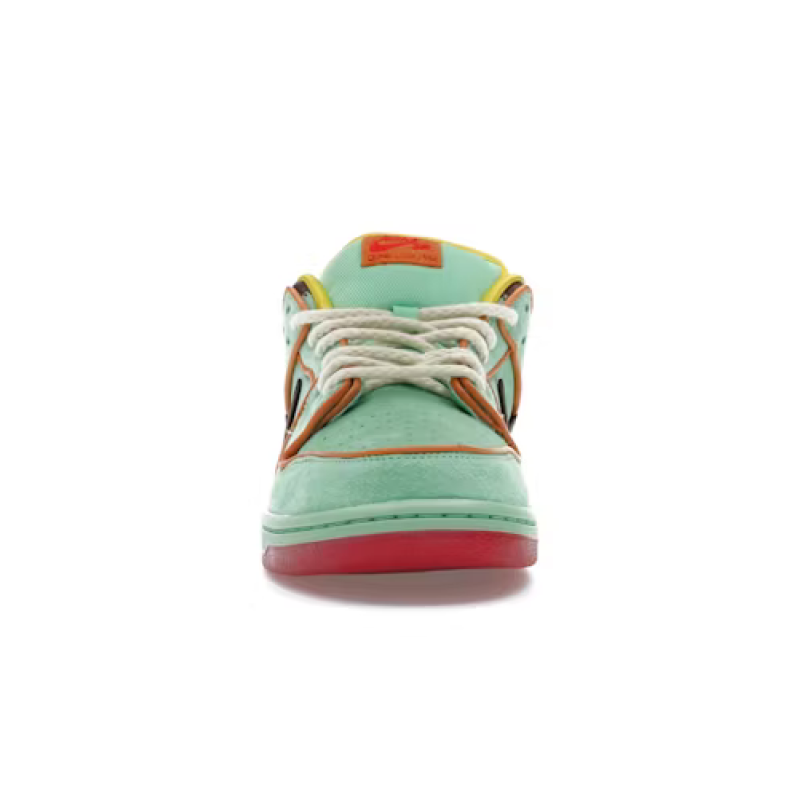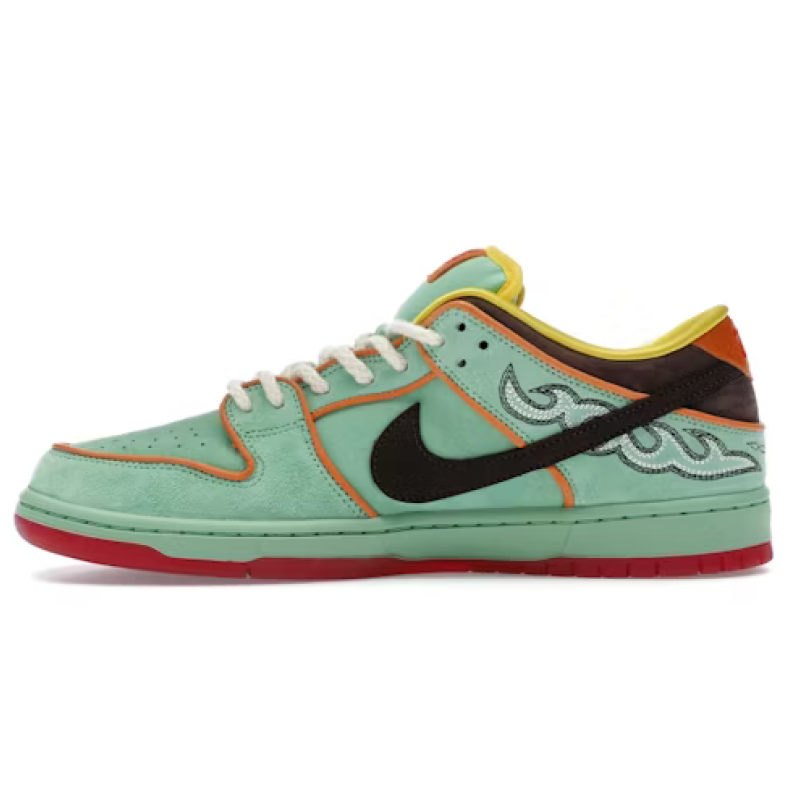 Nike SB Dunk Low Rodeo Tourmaline to unikalne sneakersy inspirowane estetyką Dzikiego Zachodu. Cholewka wykonana z wysokiej jakości zamszu łączy odcień tourmaline green z brązowymi i pomarańczowymi akcentami, które podkreślają charakter modelu. Detale, takie jak kontrastowe Swooshe, hafty na pięcie czy sznurowadła przypominające lasso, nadają całości wyjątkowego stylu. Wnętrze buta wykończone zostało satynową wyściółką z grafiką zachodzącego słońca i symbolicznie brzmiącym hasłem. Całość osadzona jest na półprzezroczystej czerwonej podeszwie, która dopełnia odważny design tego modelu.